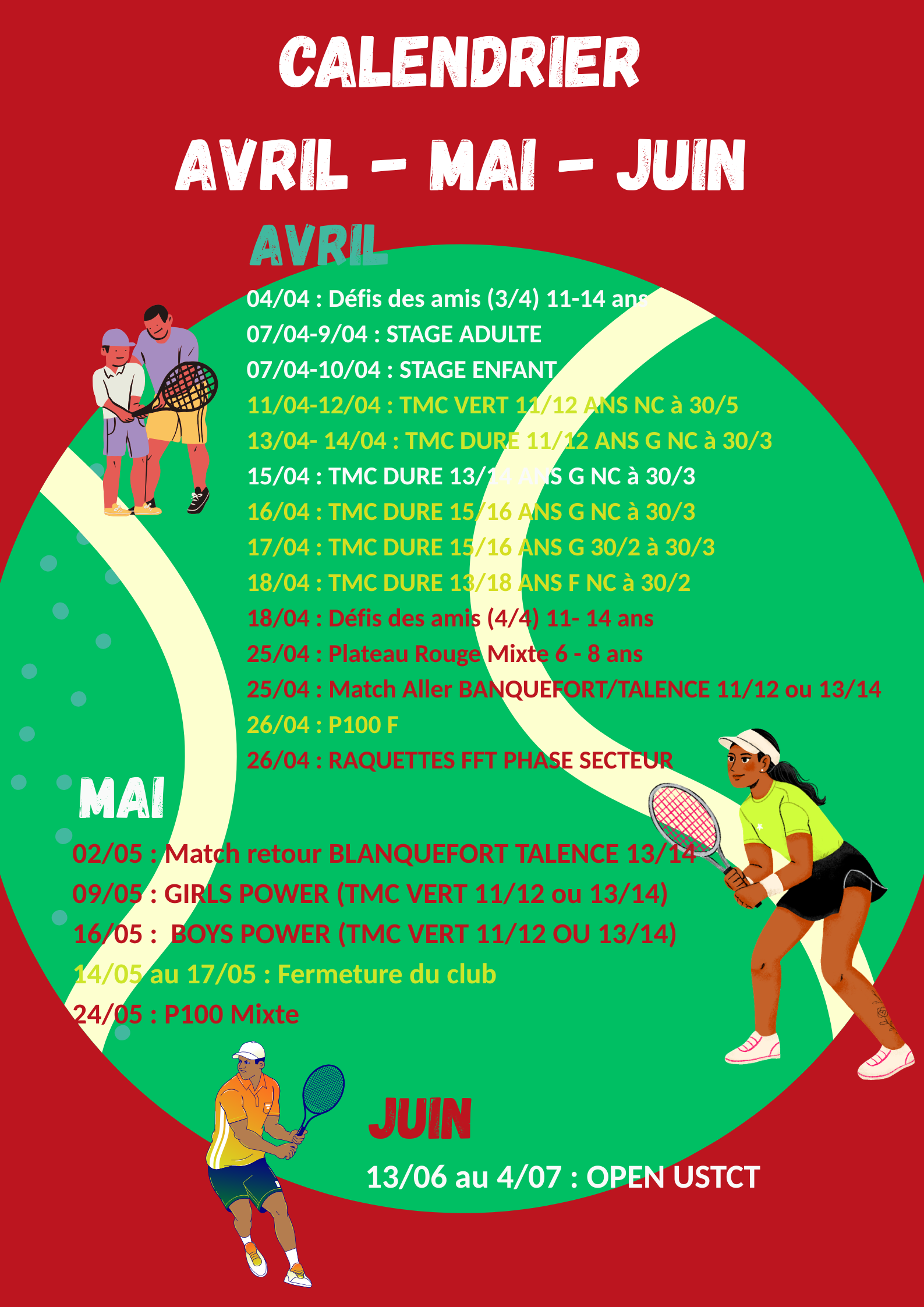 - Octobre 2025 et Janvier 2026 : Tournois jeunes balle rouge, orange et verte